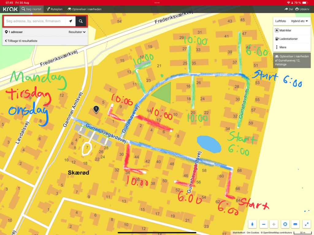 Tirsdag 10/9: Gurrehavevej 1-14 og Gurrehavegårdsvej 30-68 bedes venligst parkere på Gurrehavevej fra legepladsen og ned efter og vendepladser markeret med grøn.